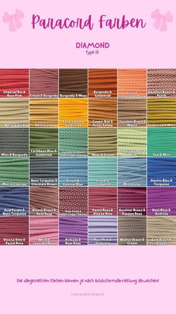 ( Bitte bis zu 3 Farben von unserer Paracord-Farbtabelle auswählen & den namen der jeweiligen Farbe angeben.) Bei Paracord-Farben mit besonderen Effekten (z. B. Glitzer oder reflektierend) bitte die Eigenschaft bei der Auswahl dazuschreiben.